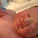 Newborn photographed with mom’s IUD in hand